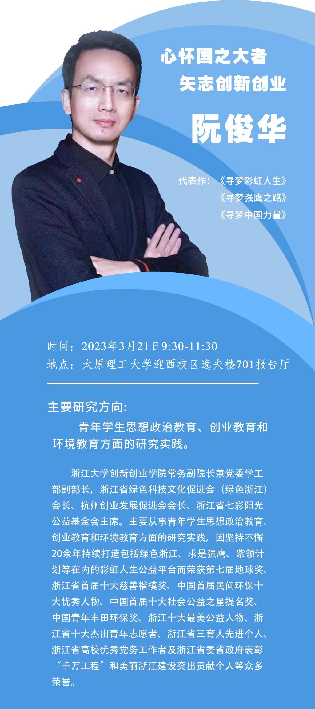 阮俊华,浙江大学304永利集团常务副院长兼党委学工部副部长,浙江省绿色科技文化促进会(绿色浙江)会长、杭州创业发展促进会会长、浙江省七彩阳光公益基金会主席。主要从事青年学生思想政治教育、创业教育和环境教育方面的研究实践,因坚持不懈20余年持续打造包括绿色浙江、求是强鹰、紫领计划等在内的彩虹人生公益平台而荣获第七届地球奖、浙江省首届十大慈善楷模奖、中国首届民间环保十大优秀人物、中国首届十大社会公益之星提名奖、中国青年丰田环保奖、浙江十大最美公益人物、浙江省十大杰出青年志愿者、浙江省三育人先进个人、浙江省高校优秀党务工作者及浙江省委省政府表彰“千万工程”和美丽浙江建设突出贡献个人等众多荣誉。