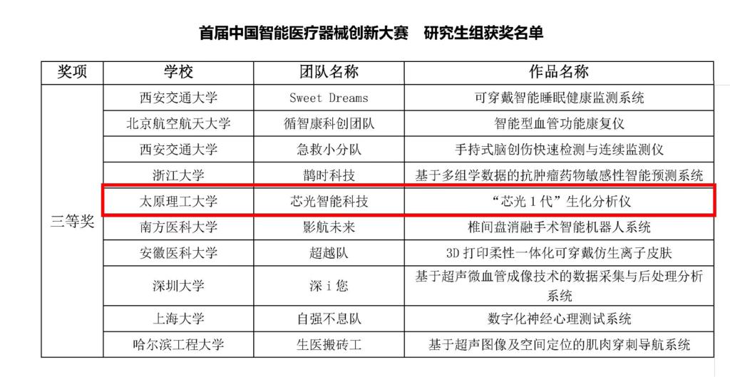 生物医学工程学院李晓春教授、青年教师张玲玲博士指导的芯光智能团队参加了决赛,项目围绕智能医疗器械研发和产业领域存在的问题,运用相关专业知识,做出具有新颖性、可行性和实用价值的参赛作品《“芯光1代”生化分析仪》,最终荣获三等奖。于2022年6月3日收到获奖证书。