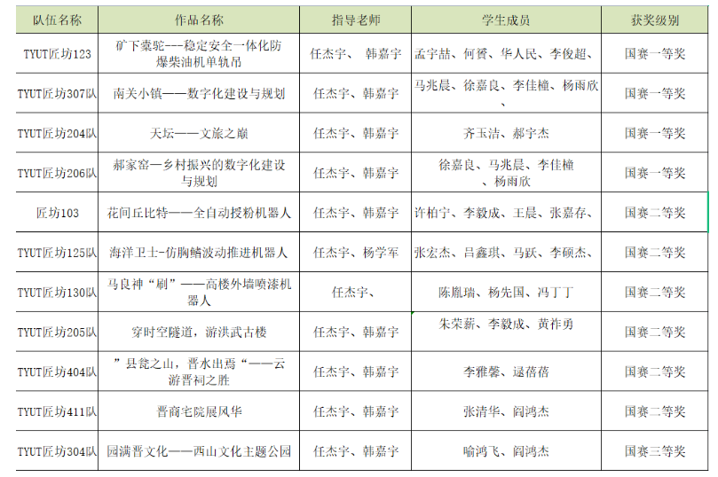 在本次比赛中,各位队员积极备战,克服疫情带来的影响,一路过五关斩六将,勇夺桂冠。天道酬勤,团队取得了傲人的成绩——获国赛一等奖4项、获国赛二等奖6项、获国赛三等奖一项!获奖队伍信息如下: