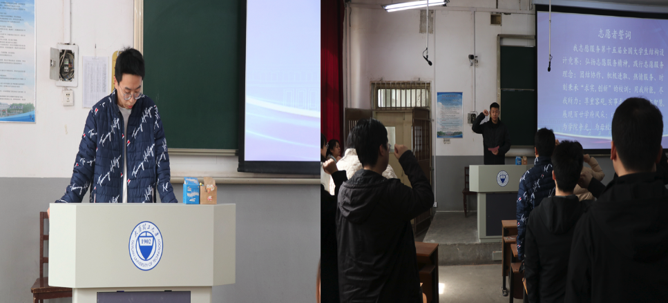 道桥1901班张子健代表志愿者表态,将勇担使命、团结协作、遵守纪律、暖心服务,展现竞赛志愿者的青春风采。随后,全体志愿者面向志愿者誓词庄严宣誓。