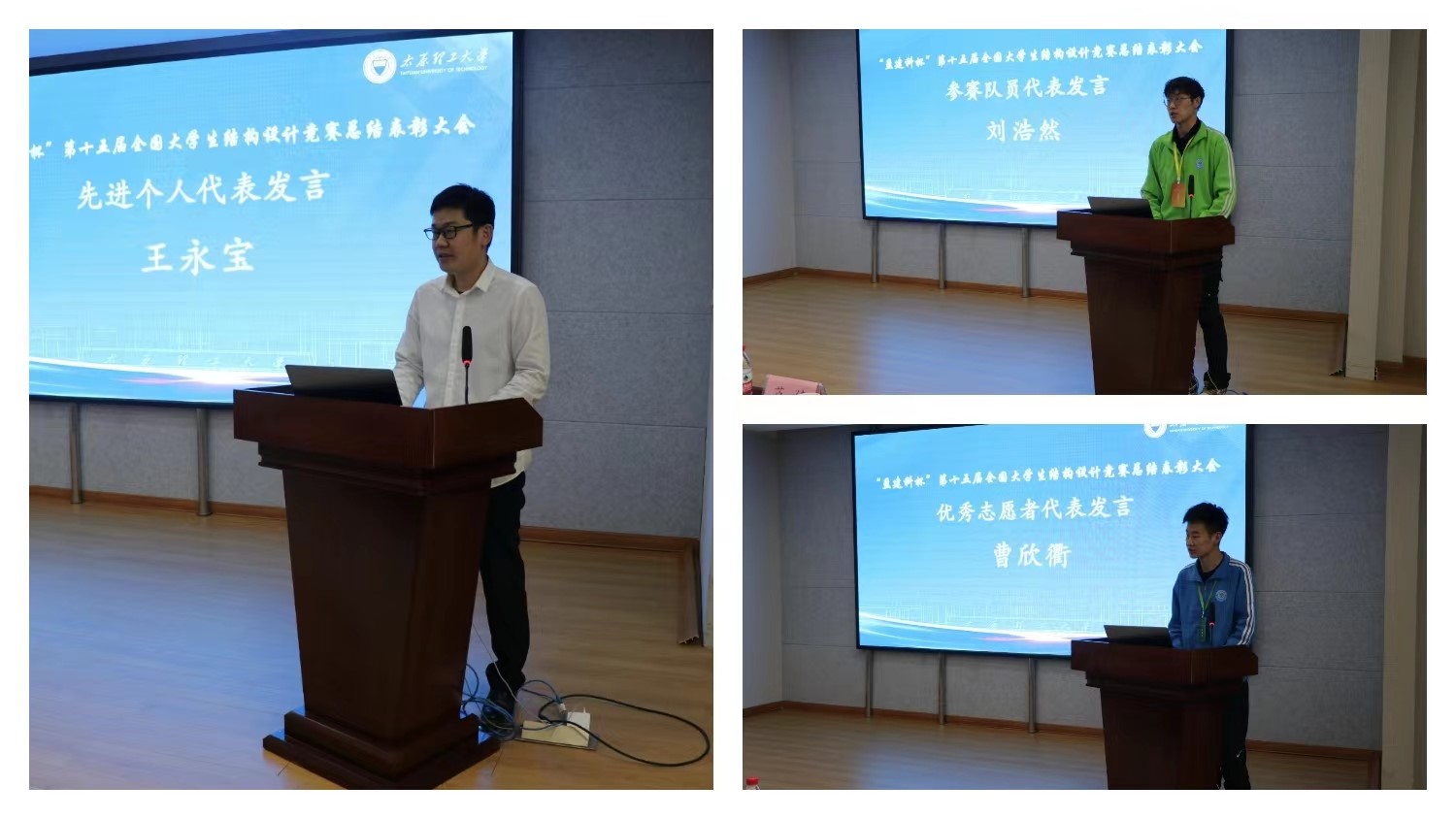 先进个人代表王永宝老师发言,他回顾了永利集团304在结构设计竞中从默默无闻到取得佳绩的艰辛历程,希望下届竞赛中我校参赛队员能再创辉煌。参赛队员代表刘浩然同学发言,他讲述了在参赛过程中的付出与成长,道出了土木学子笃实奋进、勇敢追梦的坚持与奋斗,代表全体参赛队员表达了对指导老师、竞赛筹备组老师、竞赛志愿者的感激之情。优秀志愿者代表曹欣衢同学发言,他讲述了本次大赛志愿者坚守岗位,不怕困难,迎难而上的工作精神和志愿风采。