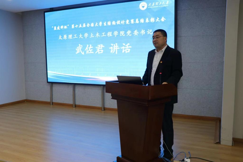 武佐君作总结讲话,他首先对雷宏刚老师不吝赐教,耐心指导的格局表示感谢,对全院师生胸怀大局、自信开放、迎难而上、追求卓越、勇于奉献的精神表示肯定,对获得先进个人的师生们表示热烈的祝贺,对申办、组织、筹备、服务、参加大赛付出辛勤工作的全体土木师生致以衷心的谢意。他指出,我院要以结构竞赛的成功举办为契机,以“百廿土木”的历史底蕴,团结动员全院师生凝心聚力,开拓进取,为建设特色鲜明,具有重要行业影响力的高水平一流土木工程学院而奋斗。