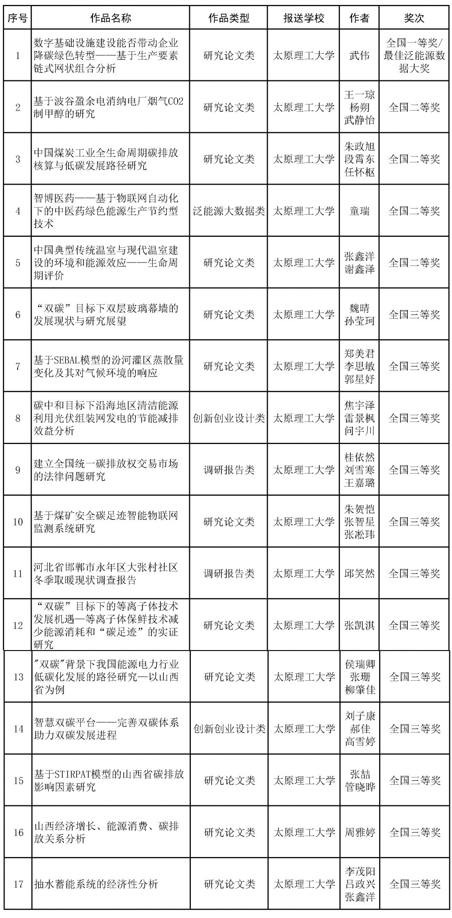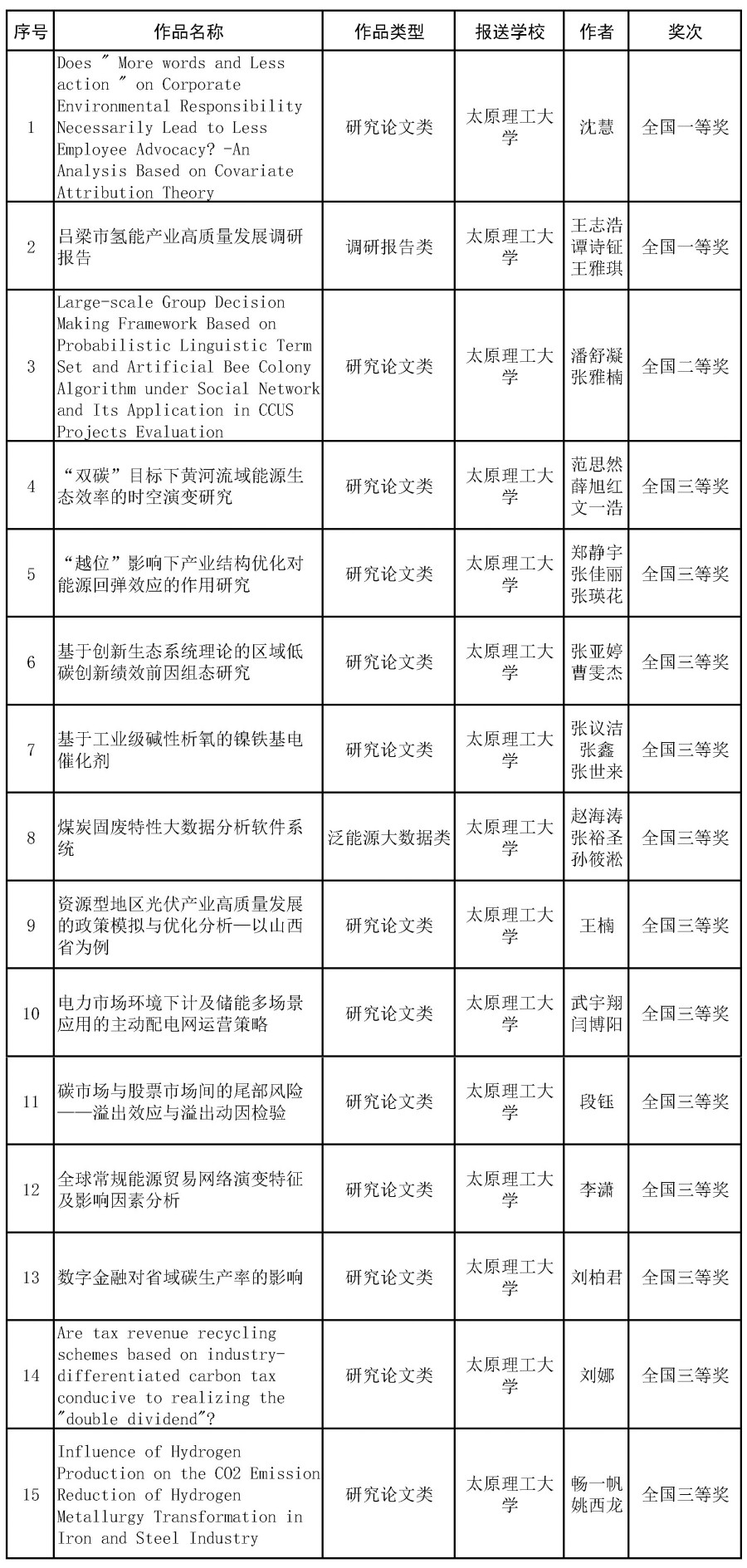 第九届全国大学生能源经济学术创意大赛自2022年12月启动以来,山西赛区共报名1602份作品,最终提交作品536份。经初审,合格作品526份。大赛分为校赛、区域赛、国赛等三级赛事,最终我校共推荐入围国赛作品135项。经大赛组委会评审,我校作品获奖情况如下:本科生组1项作品获得一等奖,4项作品获得二等奖,12项作品获得三等奖;研究生组2项作品获得一等奖,1项作品获得二等奖,12项作品获得三等奖。本科生组1项作品获得最佳泛能源大数据奖;秦芬、李静等2位教师获得大赛组织贡献奖;永利集团304获得优秀组织单位奖。