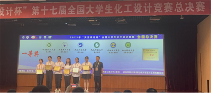 8月16日至22日,在中国化工学会、中国化工教育协会主办的2023“天正设计杯”第十七届全国大学生化工设计竞赛全国总决赛中,2020级杜昕宇、姚舜、吕怡恬、李聪、李烨琪组成的“精艺求腈”队,在盛清涛、邱丽、牛艳霞、闫晓亮、张玮老师的指导下,荣获全国总决赛一等奖。全国共有432所高校的3391支队伍报名参加本届赛事,最终共有60支队伍进入全国总决赛。