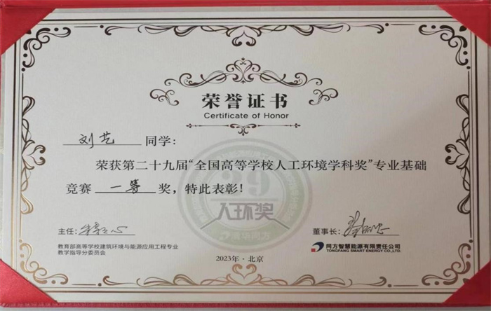 8月25日,第29届“全国高等学校人工环境学科奖”专业基础竞赛(简称“人环奖”)颁奖典礼在北京清华同方科技广场举行。我校土木工程学院建筑环境与能源应用工程专业的2020级学生刘艺在指导教师李风雷的指导下取得优异成绩,获得本届竞赛一等奖。