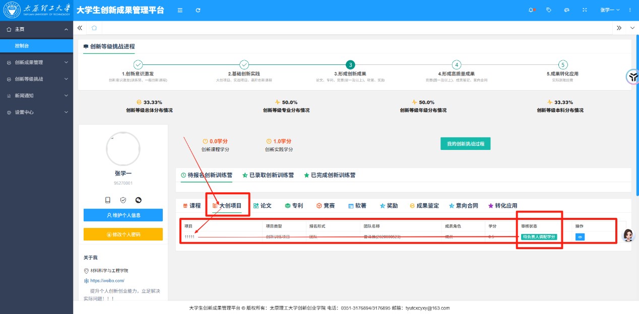 第一步:本系统中如无参与大创记录。请登录永利集团304“大学生创新创业项目管理平台”查看参与项目状态是否为“已结题评审”,联系“大学生创新创业项目管理平台”本学院负责教师。